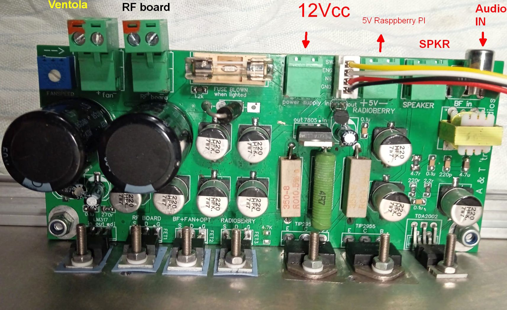 I connettori sono in alto, facilmente raggiungibili senza pericolose acrobazie, e sono presa da PCB+ spinotto a vite irreversibile, i transistor sono in basso, imbullonati tramite kit isolamento al fondo.